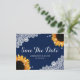 Cartão postal de convite de casamento floral rústico azul marinho com flores de girassol e aniagem adornada com renda floral branca e luzes cintilantes.