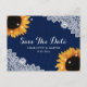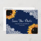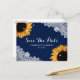 Elegante e romântico cartão postal de convite de casamento floral azul marinho com flores de girassol e renda floral branca contra um fundo de aniagem.