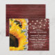 Convites de casamento country de orçamento com fundo de madeira de celeiro rústico, girassóis amarelos, renda de noiva, luzes de corda cintilantes e um modelo de casamento elegante.