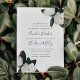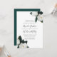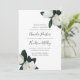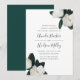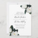 O convite para o casamento floral elegante e gracioso apresenta flores brancas de magnólia e folhas verdes escuras nos cantos, enquadrando seus detalhes de casamento em um roteiro escrito à mão, blocos e letras itálicas. Convites invertem para o verde rico.