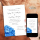 Hydrangea convite de casamento modelo com uma flor azul de hydrangea no canto. Cartões brancos com texto preto em maiúsculas impressas e script para os nomes da noiva e do noivo. O texto do convite começa com "a honra de sua presença é solicitada na cerimônia de unificação". Simples e adorável tema de casamento azul com imagem realista de flor de hydrangea. O reverso é azul sólido.