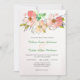 Aqui está um convite para o casamento floral que é moderno, arejado e alegre. Ele apresenta lindas flores impressionistas de estilo aquoso e folhagem como a borda superior na frente. As cores utilizadas neste design da linha de estilo livre são cor-de-coral rosa, pêssego tangerino, verde amarelo quente e azul legal. Abaixo da imagem artística está seu texto personalizado em cinzas suaves e verde escuro. A imagem e o texto são colocados sobre um fundo branco. A parte de trás do convite é uma sutil lavagem a aquarela gradiente que corresponde à cor de pêssego tangerina das flores. Clássico, e apropriado para casamentos em qualquer estação, mas especialmente primavera, verão e outono.