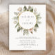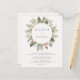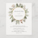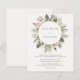 Este elegante convite para o casamento apresenta um círculo dourado rodeado por uma ilustração floral de cor d'água de rosas de marfim e verde sobre um fundo esbranquiçado. Personalize o texto da cinza de carvão com seus detalhes de casamento. O reverso é uma sombra coordenadora de esbranquiçado.