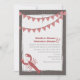 Um convite de casamento temático para o mar rústico, com uma ilustração de uma lagosta no fundo à esquerda. Um beliche de gingham vermelho no topo. O fundo é lenha. Personalize a cinza e o texto vermelho com detalhes da sua ocasião. A redação é da noiva e do noivo.