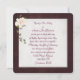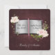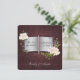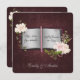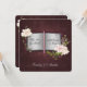 Livro de histórias de casamento com buquê floral em damasco de marrom profundo.