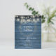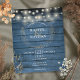 Com luzes bonito de cordas, seus nomes estão enquadrados em uma garland de louros acima de sua data especial de casamento e detalhes de local, definidos em chic, elegante tipografia clássica em um fundo azul de madeira rústica neste convite para casamento de na moda. O inverso tem suas iniciais ou monograma moldado por uma garland floral laurel. Projetado por Thisnotme©