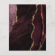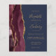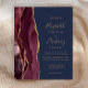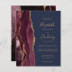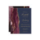 A borda esquerda deste elegante convite de casamento moderno mostra uma borda de água de cor azul, aparada com brilho dourado. O texto personalizável combina manuscrito dourado, fontes em copperplate e itálico em um fundo azul marinho. O lado inverso apresenta uma burgundy e uma design de agata dourada.