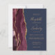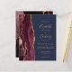 A borda esquerda deste elegante convite de casamento moderno mostra uma borda de água de cor azul, aparada com brilho dourado. O texto personalizável combina manuscrito dourado, fontes em copperplate e itálico em um fundo azul marinho. O lado inverso apresenta uma burgundy e uma design de agata dourada.