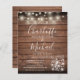 Um convite de casamento para na moda rustic em orçamento com bonito luzes de cordas, frascos-pedras, nomes de estilo de assinatura e tipografia quic em um fundo de madeira rústica. Projetado por Thisnotme©