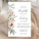 A borda esquerda deste convite romântico de casamento apresenta buquê floral de cor d'água de pêssego e flores e verde. O texto personalizável combina manuscrito, copperplate e fontes itálicas em cinzas de carvão em um fundo branco. O verso apresenta uma cor sólida coordenadora.