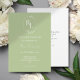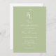 Belo cartão de convite para casamento verde-claro e branco. Este modelo apresenta um conjunto contemporâneo de fontes contra um fundo verde-menta claro na frente do cartão. As iniciais de casal em branco são moldadas por uma delicada borda floral branca. A parte traseira da placa inclui uma área de texto adicional para detalhes do site e prompt RSVP. Este item faz parte de uma suíte de núpcias de casamento que inclui uma seleção feita de papel de carta a combinar.