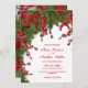 Convite de casamento de Natal, o layout apresenta galhos de pinheiros e bagas vermelhas. O dorso é decorado com galhos de pinheiro e um belo arco vermelho