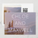 Este convite de casamento moderno e minimalista traz uma foto de página de cheio com uma bela e ousada camada de texto destacando os nomes dos casais. A data e o local destacam o tipo principal. O verso deste luxo cartão com fotos de convite para casamento inclui uma fotografia adicional e um código QR para direcionar os convidados para o site do casamento para mais detalhes. Esse convite de casamento é perfeito para casais que buscam uma estética simples e moderna que enfatize a fotografia e os nomes dos casais.