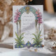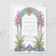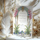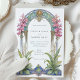 Este luxuoso convite de casamento captura a essência de Art Nouveau com seu intrincado design floral, com um espetacular arco enfeitado com orquídeas elegantes. A frente do convite mostra orquídeas lindamente detalhadas em tons quentes de pêssego, lavanda e rosa-pincel, todas colocadas sobre um fundo branco clássico. O convite é formado por linhas fluidas, orgânicas e um rico motivo botânico que expele sofisticação e graça. O verso do convite continua o tema floral com um vibrante jardim de orquídeas em um fundo azul profundo, de meia-noite, criando um contraste impressionante que é simultaneamente eterno e moderno. Perfeito para casais que buscam um convite refinado e elegante que fale de amor à natureza e design clássico.