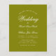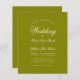 Um simples convite para casamento de orçamento minimalista. Tem apenas um texto branco sobre fundo verde-oliva. A palavra Casamento e os nomes são escritos em um roteiro caligráfico elegante.
