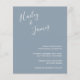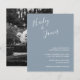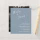 Convite para casamento de orçamento moderno com um design simples com seus nomes em um roteiro manuscrito elegante no canto superior esquerdo e seus detalhes de evento no alinhamento direito no canto inferior direito. O fundo tem sua foto favorita. Todos os elementos de design estão em azul empoeirado e podem ser alterados na ferramenta de edição de design. A letra chic da mão acrescenta um toque romântico a esta design minimalista.