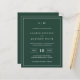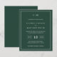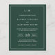 Simples convite de casamento orçamentário com um design moderno, mas elegante, com seu monograma de duas letras no topo, um layout ousado de data e seus detalhes cercados por uma borda fina. Todos os elementos de design estão em branco sobre um fundo verde da floresta e podem ser alterados na ferramenta de edição de design. Um design chic e na moda que é excelente para um casal minimalista.