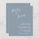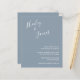 Convite para casamento de orçamento moderno com um design simples com seus nomes em um roteiro manuscrito elegante no canto superior esquerdo e seus detalhes de evento no alinhamento direito no canto inferior direito. Todos os elementos de design estão em azul empoeirado e podem ser alterados na ferramenta de edição de design. A letra chic da mão acrescenta um toque romântico a esta design minimalista.