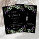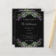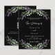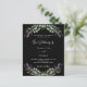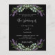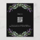 Um fundo preto decorado com flores lavandas e verde de eucalipto. Personalize e seus nomes e detalhes. Voltar: adicione o URL do site de casamento ao código QR para obter detalhes e/ou RSVP. 1 folha = 1 convite impresso de borda a borda.