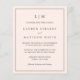 Simples convite de casamento orçamentário com um design moderno, mas elegante, com seu monograma de duas letras no topo e seus detalhes cercados por uma fronteira fina. Todo o texto está em cinzas sobre um fundo cor-de-rosa pincelado. As fontes e as cores de fundo podem ser alteradas para qualquer cor desejada clicando no botão "personalizar". Estes convites baratos de casamento são excelente de um casal minimalista.