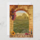 Convite de casamento clássico com tema de vinho, apresentando uma pintura de paisagem italiana toscana com um arco romano, uvas, vinho e um girassol. No verso, há um modelo de código QR para linkar ao site do seu casamento.