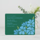 Flores grandes, arrojadas e estilizadas, azuis-céu suportam detalhes de casamento em um verde-caçador rico — ou uma cor complementar da paleta de cores de seu casamento. Monograma.