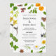 Esse convite elegante e moderno é ideal para um casamento com tema orgânico ou ao ar livre. Apresenta imagens de ervas, flores, sementes e plantas sobre fundo branco. design limpa com socos de cor ideais para um casal moderno com gosto por coisas naturais.