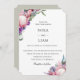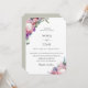 Lindos arranjos florais exóticos de protea-rei e folhagem em tons de rosa, roxo e verde, convite para o casamento. A parte traseira da placa apresenta cor verde-clara.