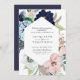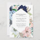 Lindas marcas de aquarela de marinho azul, cor-de-rosa pincel, azul empoeirado e flores esticadas, convite para casamento elegante. A parte traseira da placa apresenta cor azul marinho sólida.