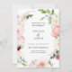 Belo quadro floral de aquarela, convite de casamento. Sombras de rosa, marfim, azul, verde e vermelho de morango. Estilo elegante e moderno de design de tipografia. A parte traseira do cartão, mostrada em creme cor-de-rosa, pode ser personalizada.