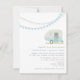 Um convite de casamento com ilustração de um trailer de safra azul com um cheio de flores coloridas. Cinzas e bunting azul no topo. Personalize o texto.