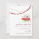 Um convite de casamento com uma ilustração de um trailer vermelho com cheio de margaridas e suspiros de olhos pretos. Vermelho e cinza no topo. Personalize o texto.