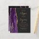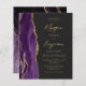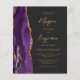 A borda esquerda deste elegante convite de casamento moderno apresenta uma cor d'água roxa, borda agitada, aparada com falso brilho dourado. O texto personalizável combina o script dourado moderno e o sans serif fonts em um fundo preto de slate. O verso apresenta um design de agate roxo e dourado correspondente.