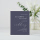 Este convite de casamento simples e elegante contém a palavra "casamento" em escrito na moda branco. Personalize-o com os nomes da noiva e do noivo em letras maiúsculas de serifa brancas (juntadas pela palavra "e" no script que corresponde a "casamento") e o texto restante em itálico branco em minúsculas alinhado com a margem direita em um fundo azul marinho escuro.