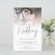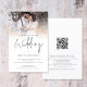POR FAVOR, OBSERVE QUE HÁ UM convite por folha. Convite de Casamento de Script de Código QR de Sobreposição de Foto de Orçamento. Um tamanho maior de 5,5" x 8,5" a um preço orçamentário, em um STOCK CARD SEMI GLOSS de 110 lb, excelente de convites, aproximadamente na mesma espessura de um cartão postal, ou um estoque LINEN elegante de 110 lb - para um luxo, ligeiramente mais fino, com um valor de excelente. OBSERVE QUE OS ENVELOPES OPCIONAIS SÃO UM POUCO MAIORES EM TAMANHO A 6,75" x 9" aprox. Este alternativo de tamanho de orçamento também está disponível em outras opções de papel. O papel FELT de 100 lbs é colorido por buff, NÃO branco, então adiciona um toque rústico. O estoque de papel MATTE de 80 lb é branco brilhante, para impressão nítida, excelente para seus menus e programas, enquanto o papel SATIN de 80 lb é fino e leve, ideal para gabinetes. Com um código QR para o seu site de casamento no verso para que seus convidados possam RSVP e ver todos os detalhes on-line sem a necessidade de gabinetes separados. Seu código QR será gerado automaticamente para atualizar o código de amostra no design, quando você simplesmente alterar o URL de amostra no modelo com o URL do seu próprio site de casamento. Uma tipografia informal em preto para o título principal Casamento complementando o resto do texto que você pode facilmente personalizar. Substitua a foto de exemplo pelo seu favorito.