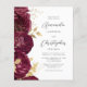 A borda esquerda deste elegante convite de casamento apresenta uma borda floral burguenta, aparada com folhas falsas de ouro e folhas reluzentes. O texto personalizável combina o script inspirado em vintage de cinzas de carvão e fontes sans serif em um fundo branco. O verso apresenta um design floral correspondente.