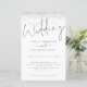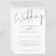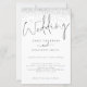 Convite de casamento de Script Glitter Moderno Silver. Um tamanho maior de 5,5" x 8,5" a um preço orçamentário, em um STOCK CARD SEMI GLOSS de 110 lb, excelente de convites, aproximadamente na mesma espessura de um cartão postal, ou um estoque LINEN elegante de 110 lb - para um luxo, ligeiramente mais fino, com um valor de excelente. OBSERVE QUE OS ENVELOPES OPCIONAIS SÃO UM POUCO MAIORES EM TAMANHO A 6,75" x 9" aprox. Este alternativo de tamanho de orçamento também está disponível em outras opções de papel. O papel FELT de 100 lbs é colorido por buff, NÃO branco, então adiciona um toque rústico. O estoque de papel MATTE de 80 lb é branco brilhante, para impressão nítida, excelente para seus menus e programas, enquanto o papel SATIN de 80 lb é fino e leve, ideal para gabinetes. Casamento está em um roteiro de na moda por set no topo e na elegante tipografia abaixo com seus detalhes. Uma borda cintilante de falso prateado atravessa o topo. Personalize facilmente o resto do texto para seus próprios detalhes. Você também pode alterar as cores do texto e do plano de fundo por meio da opção personalizar mais, se desejar.