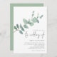 Elegante Eucalyptus Sai Do Convite De Casamento. Uma ramificação de folhas de cor aquosa verde do eucalipto corre diaganalmente para cima do lado esquerdo e a redação está alinhada à direita abaixo. O Casamento de está em um script de conjunto de estilo manuscrito e o resto do texto que você pode personalizar facilmente. Um verde-sábio coordenador está atrás.