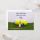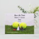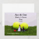 Cartão de convite de casamento de tênis com noivo e noiva na grama verde com fundo de bolas de tênis