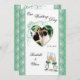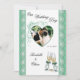 Este belo design de convite para fotos de casamento dos óculos de champanhe apresenta 2 óculos de champanhe amarrados com uma fita verde, modelo de foto de coração costurado em verde-menta em um fundo verde-menta e branco revestido com um design de rosa de renda branca. Este design de convite de casamento para rosa de renda branca e verde elegante pode ser personalizado para o seu dia de casamento especial mudando o texto, o estilo da fonte e a cor do seu texto e até adicionar sua própria fotografia favorita!