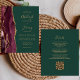 Economize o custo de imprimir e enviar cartões RSVP separados com este elegante convite de casamento de orçamento integral. A borda esquerda apresenta uma borda de cor d'água borrifada, aparada com brilho dourado. O texto personalizável combina manuscritos dourados, placas de impressão e fontes itálicas em um fundo verde esmeralda. O verso fornece espaço para detalhes do casamento em um fundo verde esmeralda sólido, junto com um código QR que os convidados podem digitalizar para visitar seu site e RSVP.
