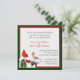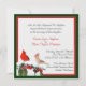 Elegante convite de Casamento no inverno personalizado feito em cores de feriado do inverno branco, vermelho e verde florestal profundo. Gráficos surpreendentes de uma ave cardinal macho e fêmea, sentada em um galho coberto de neve, com frutas vermelhas, decora o canto inferior esquerdo do convite, e um quadro vermelho e verde ao redor das bordas do convite. O texto em um script preto e vermelho é totalmente personalizável para personalizar conforme desejar. Belo convite de casamento para o inverno.
