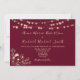 Convite de casamento elegante com um fundo burgundy rico, luzes brilhantes de cordas e roteiro de caligrafia romântico. Acentuado com o rendas floral dourado, este design moderno é perfeito para casamentos outono ou rústicos. Adicione seu código QR na parte traseira para obter acesso fácil ao RSVP ou ao site de casamento.