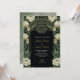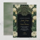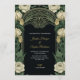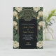 Convite de casamento elegante com fundo escuro, borda floral ornamentada em tons de verde e creme. O texto em cursiva dourada transmite um tom formal e clássico.