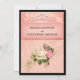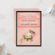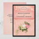 Um convite de casamento com um buquê de rosas florais com flores brancas e rosadas. Uma tiara de diamante falsa. O fundo é rosa com um padrão floral. Desenho bonito e elegante.