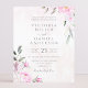 Um elegante convite de casamento floral com flores cor d'água cor-de-rosa com caligrafia manual moderna.