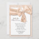 Lindo convite de casamento personalizado em pêssego, feito com um fundo semelhante a damasco em pêssego pálido. Uma área de texto com camadas brancas é encimada por um laço de cetim em cor de pêssego, com enfeites de pérolas. Personalize todo o texto para atender às necessidades do seu casamento. Produtos combinando disponíveis.