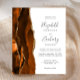 A borda esquerda deste convite de casamento moderno e elegante apresenta uma borda de ágata em aquarela laranja queimada aparada com brilho dourado falso. O texto personalizável combina caligrafia cinza carvão, copperplate e fontes itálicas. O verso apresenta um design de ágata laranja queimada e dourada correspondente.