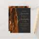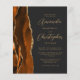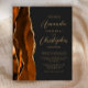 A borda esquerda deste convite de casamento moderno e elegante apresenta uma borda de ágata em aquarela laranja queimada aparada com brilho dourado falso. O texto personalizável combina fontes douradas em script e sem serifa em um fundo preto de ardósia. O verso apresenta um design de ágata laranja queimada e dourada correspondente.