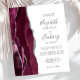 A borda esquerda deste convite de casamento moderno e elegante apresenta uma borda de ágata em aquarela bordô aparada com brilho falso prateado. O texto personalizável combina caligrafia cinza carvão, copperplate e fontes itálicas em um fundo branco. O verso apresenta um design de ágata bordô e prateado correspondente.